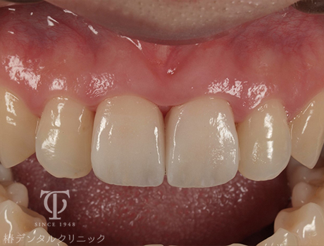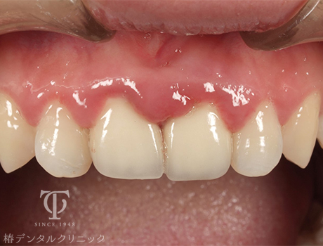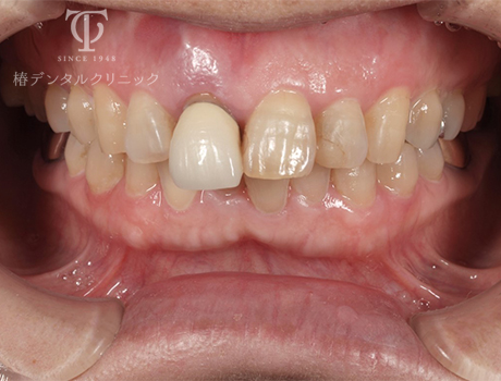 以前治療した前歯2本の被せ物の適合が悪く歯肉に炎症を起こしていました。歯周病治療をした後に、オールセラミッククラウンにて修復しました。