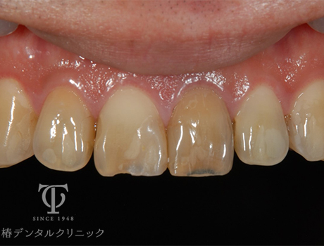 交通事故で歯が折れてしまった患者様で、最小限の歯の切削で製作可能なラミネートベニアという方法で修復しました