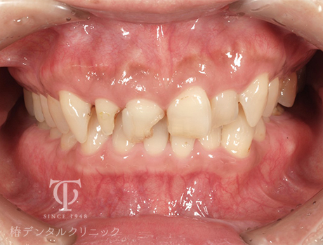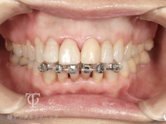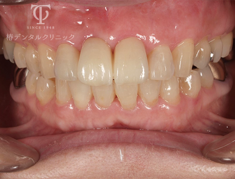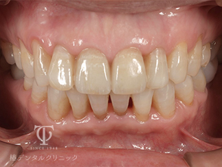 部分矯正治療で歯のポジションを整え、下顎はオールセラミックブリッジ、上顎はラミネートベニアにて修復しました。