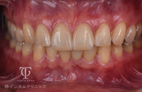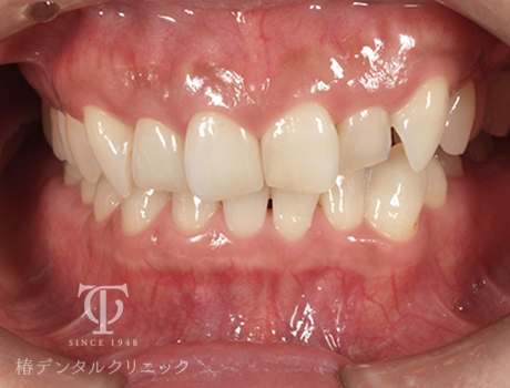 以前治療した前歯2本の被せ物の適合が悪く歯肉に炎症を起こしていました。歯周病治療をした後に、オールセラミッククラウンにて修復しました。