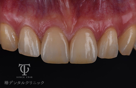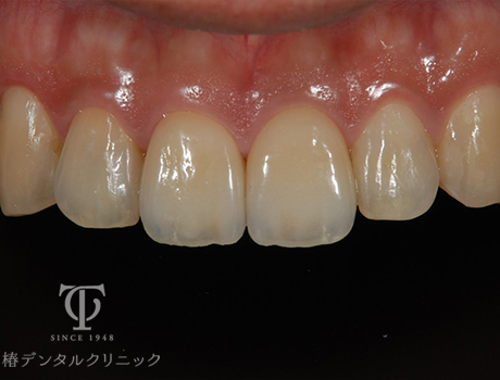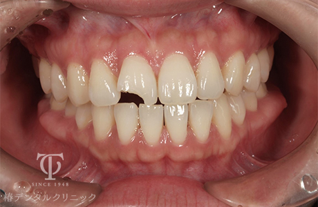 交通事故で歯が折れてしまった患者様で、最小限の歯の切削で製作可能なラミネートベニアという方法で修復しました